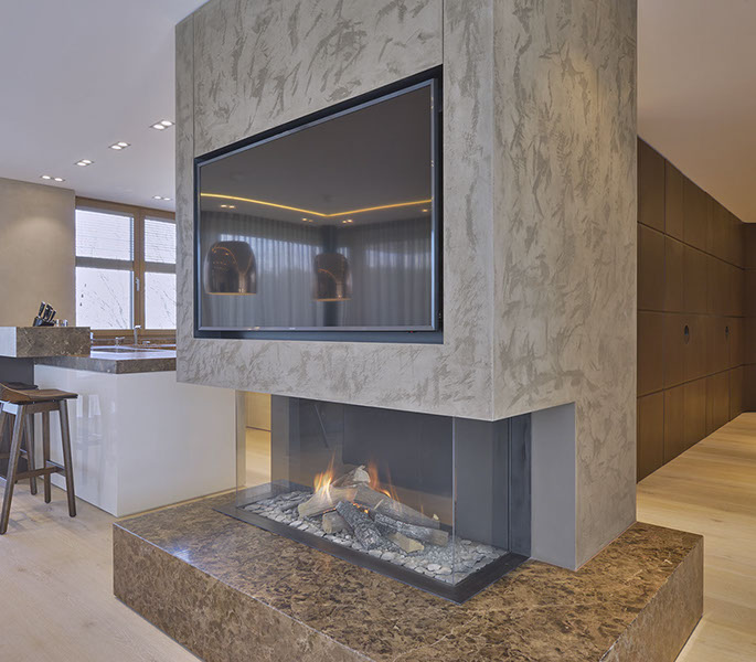 Das Penthouse in Freudenstadt wurde mit großformatigen Natursteinplatten, dessen Maserung durchlaufend gestaltet wurde, ausgestattet. Die Natursteinfugen wurden händisch gespachtelt und anschließend plan überschliffen, sodass der Eindruck entsteht, als ob es sich um eine ganze Natursteinrohplatte handelt. Ebenso entstand im Küchen- und Wohnbereich in Zusammenarbeit mit dem Schreiner eine massiv verkleidete Kamin- und Küchenarbeitsplatte mit entsprechender Unterkonstruktion.