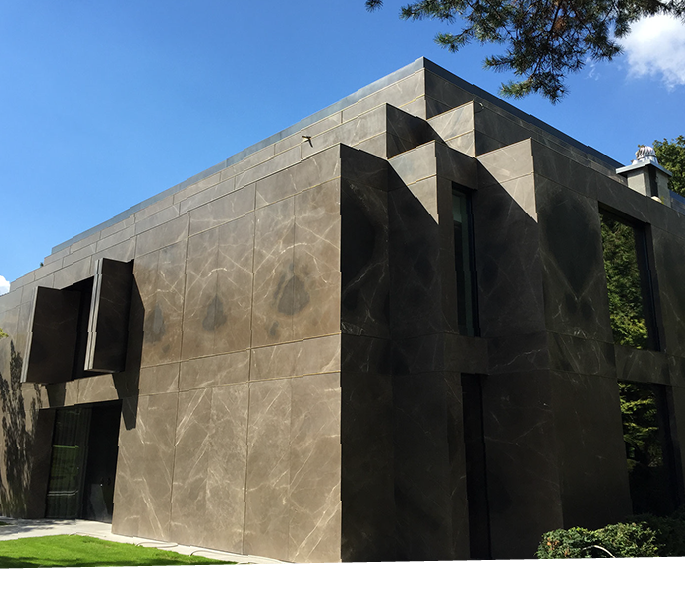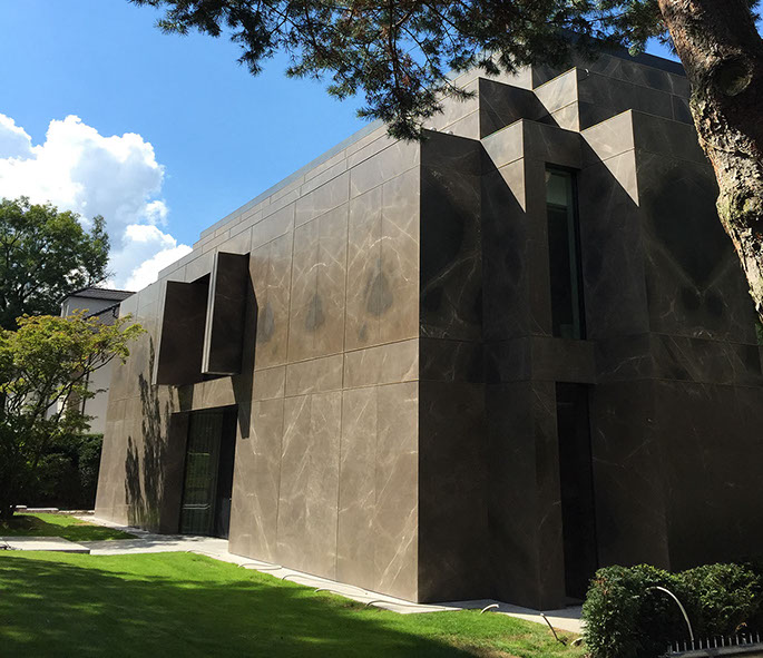 Die Konstruktion dieser einzigartigen Natursteinfassade mit Plattengrößen von rund 310 x 150 cm und einer Stärke von ca. 6,0 cm wurde speziell für dieses Projekt entwickelt. Sie bedurfte als Einzelfall der Zustimmung durch die oberste Baubehörde. Eine Trägerplatte aus Granit wurde mit einer Marmorplatte verklebt und mittels Fischer-Hinterschnitttechnik und Edelstahlkonstruktion montiert. Eine Einzelplatte wiegt ca. 795 kg. Die durchlaufende Maserung des Marmors wurde gemeinsam mit dem Bauherren und Architekten im Vorfeld durch 3D-Renderings festgelegt.